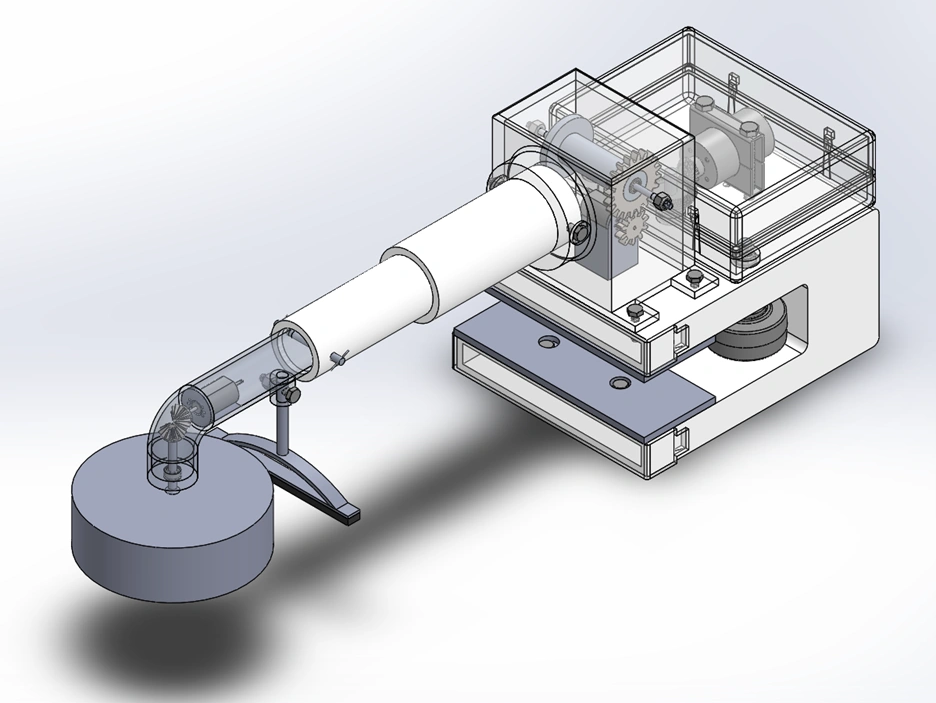 This is the final prototype constructed, with working telescoping arm motors and wheel axle motors. The whole iterative design process really demonstrated the difficulties and challenges that come with design and manufacturing. Despite various challenges the team was able learn valuable lessons should another version of the model be pursued. As chief engineer on the team I led the design, solid modeling, and electrical system.