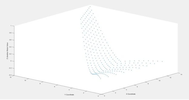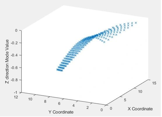 During my graduate-level vibration analysis class, I worked on a project to find and display mode shapes based on given mass and stiffness matrices for a wing. As well, natural frequencies, static displacements, and free displacements were found for the wing. This image was the first mode shape for the z-axis, corresponding to a natural frequency of 2.26 Hz.